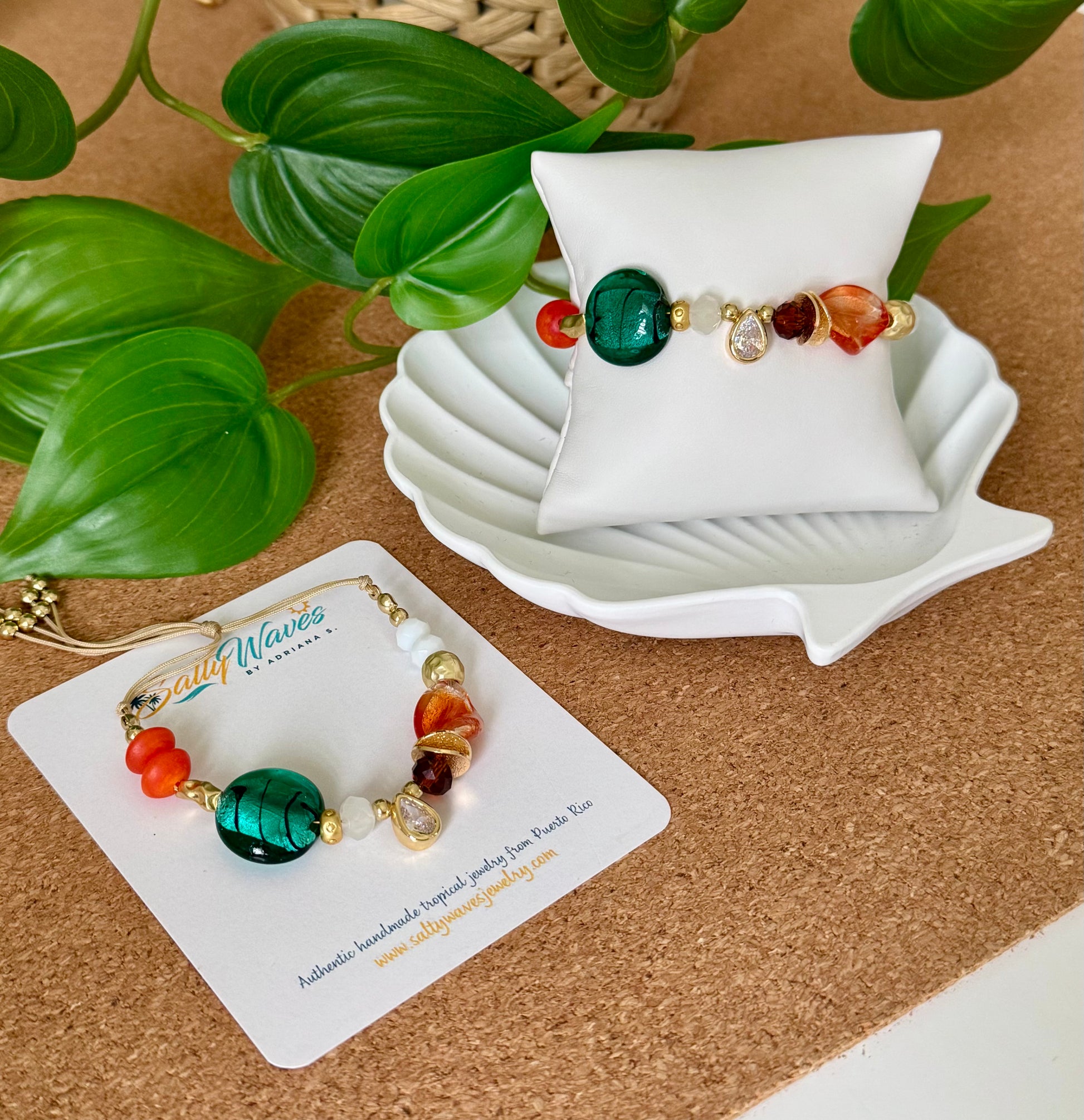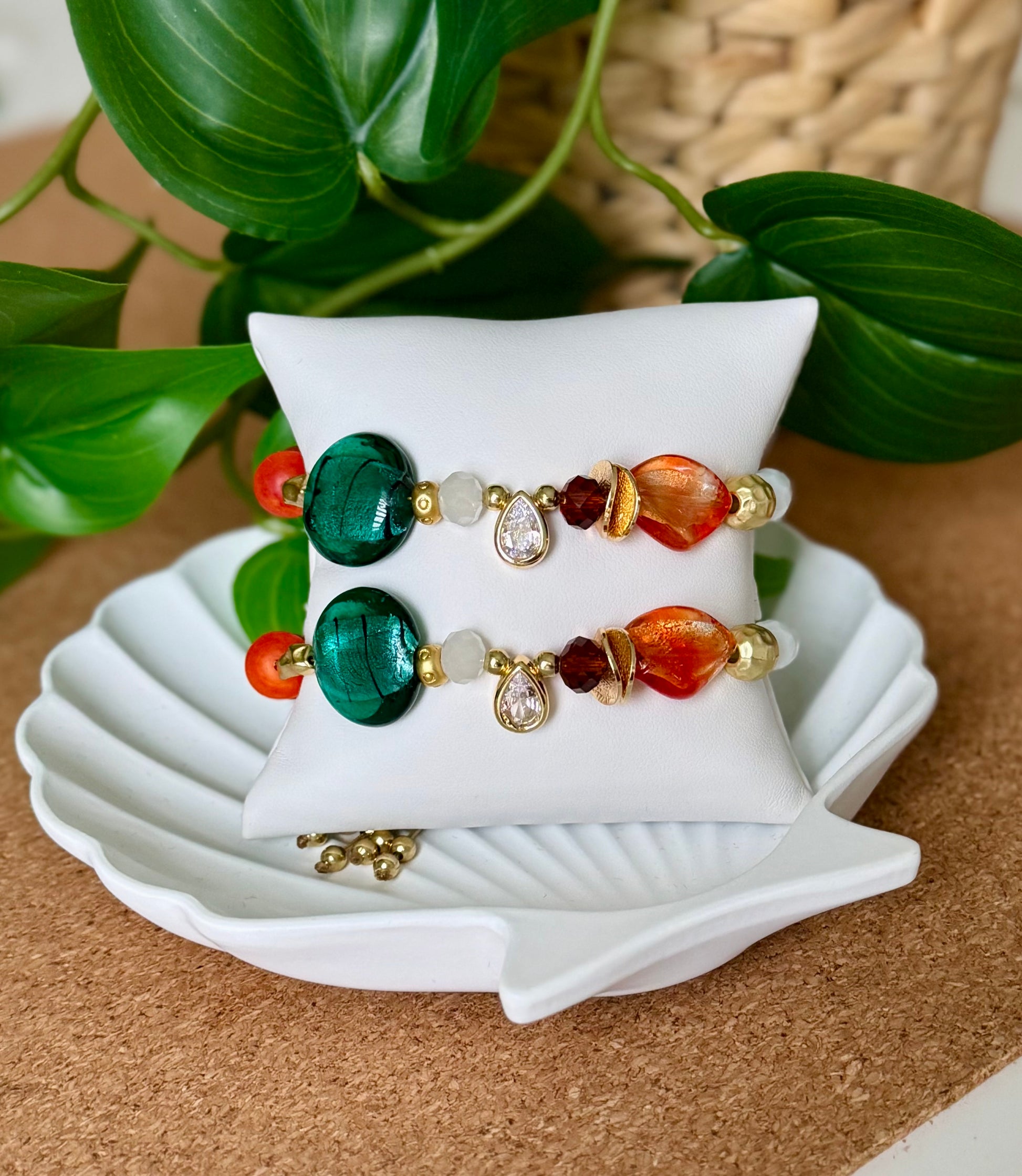 Pulsera delicada con tonos esmeralda y ámbar, detalles dorados y un charm en forma de gota que aporta un brillo sutil y sofisticado. Perfecta para un look natural y elegante.