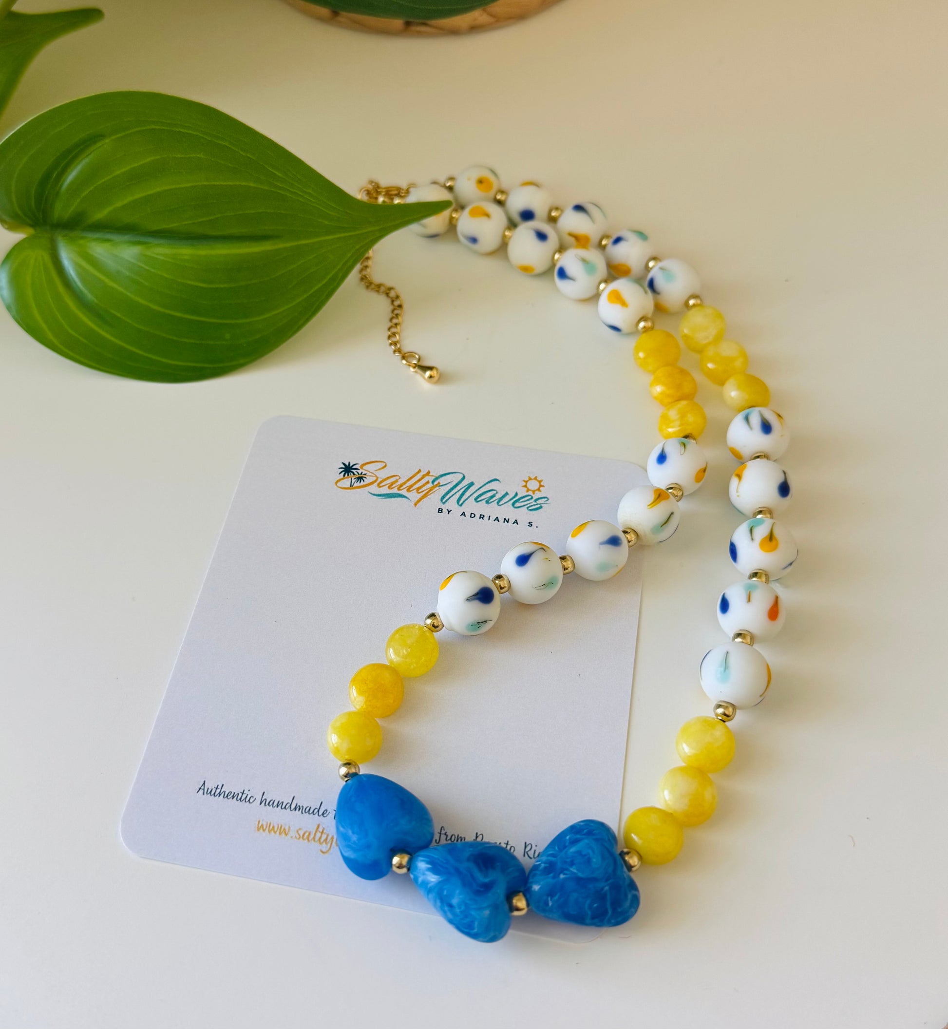 - Collar liviano hecho con materiales como jade, resina y cuentas con acabado mate y efecto mármol.