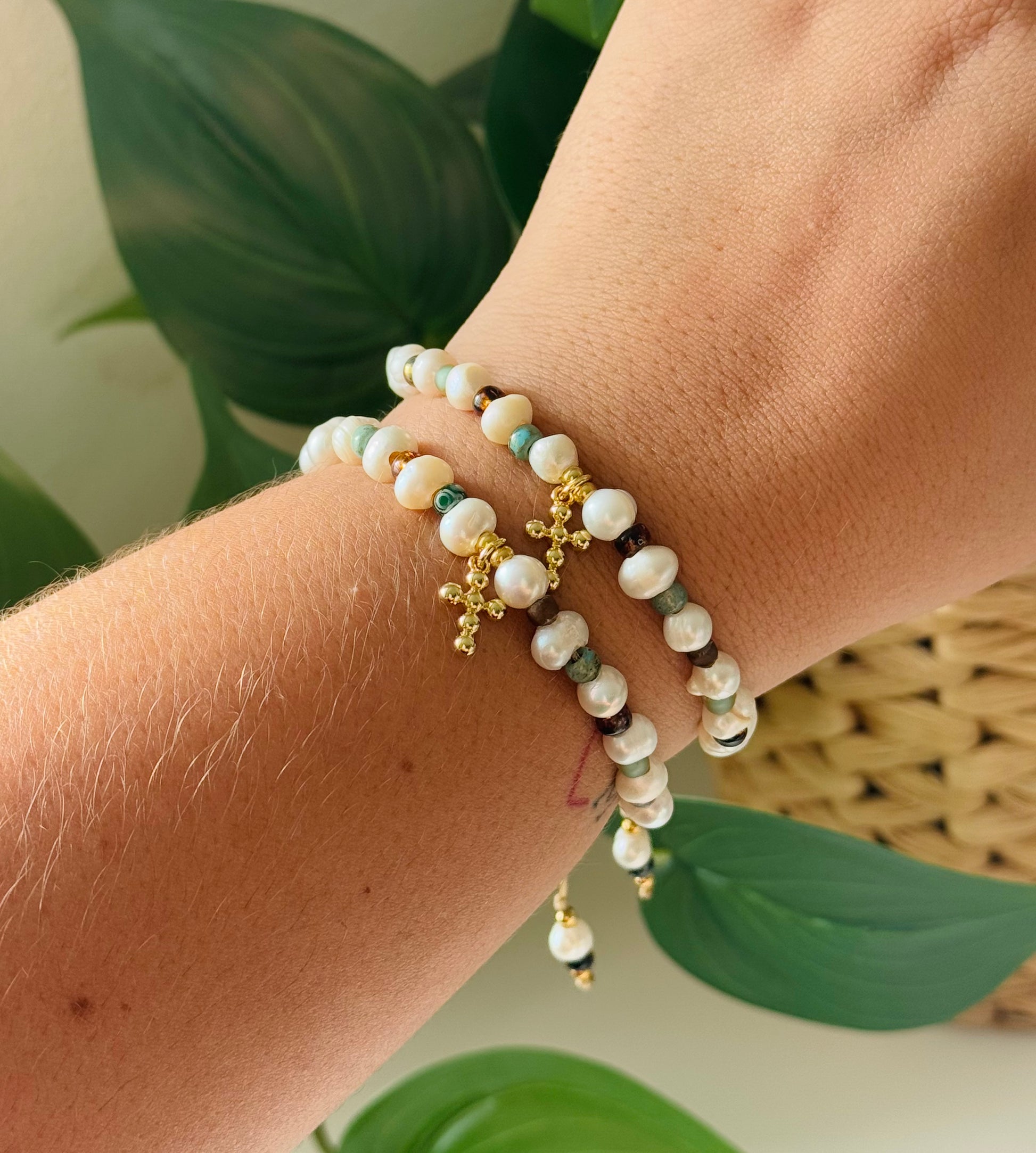 Hecha a mano con perlas naturales, tonos tierra y detalles enchapados en oro, esta pieza representa la paz y la gratitud que nos regala cada amanecer junto al océano.