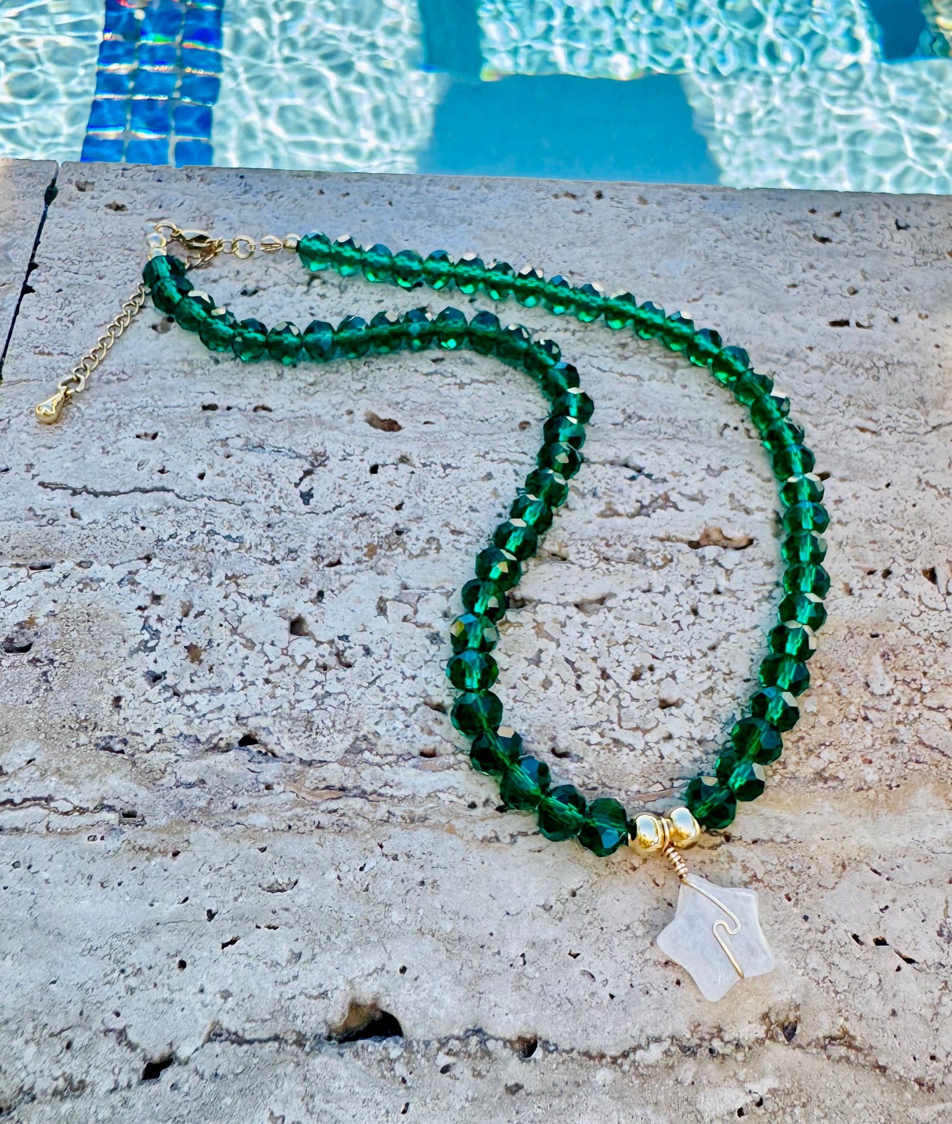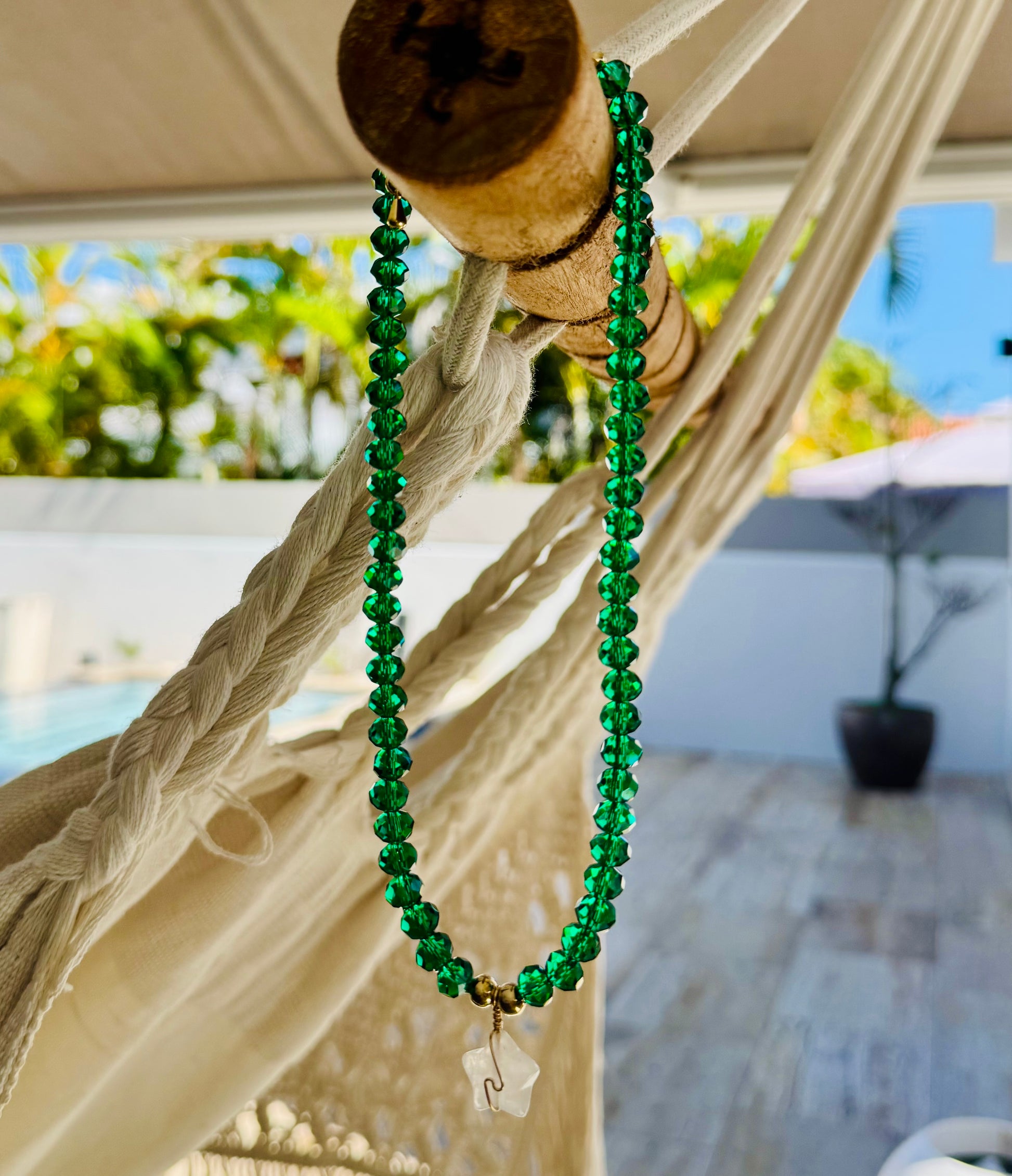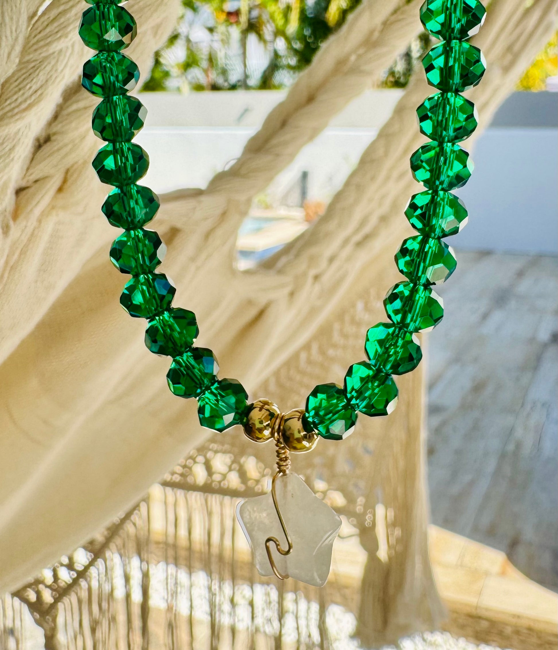 Inspirado en el brillo natural del mar y la serenidad de la costa, Costa Esmeralda es un collar que refleja frescura, elegancia y conexión con la naturaleza. Sus cuentas verde esmeralda capturan la luz como el agua cristalina, mientras el delicado charm de estrella en cuarzo añade un toque sutil y femenino.