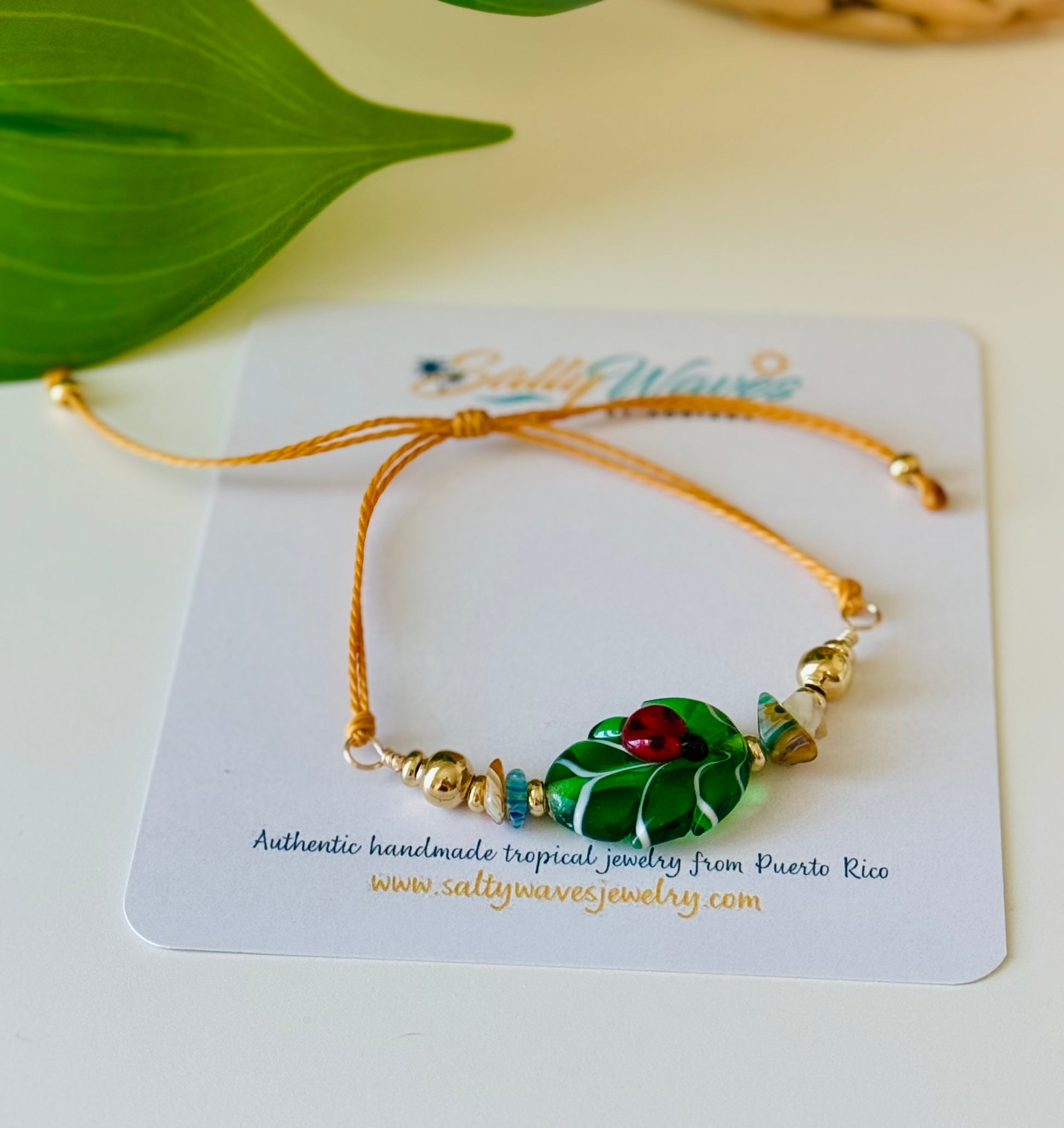 - Pulsera en hilo ajustable con hoja en lampwork, detalles en cristal y stainless steel color oro.
