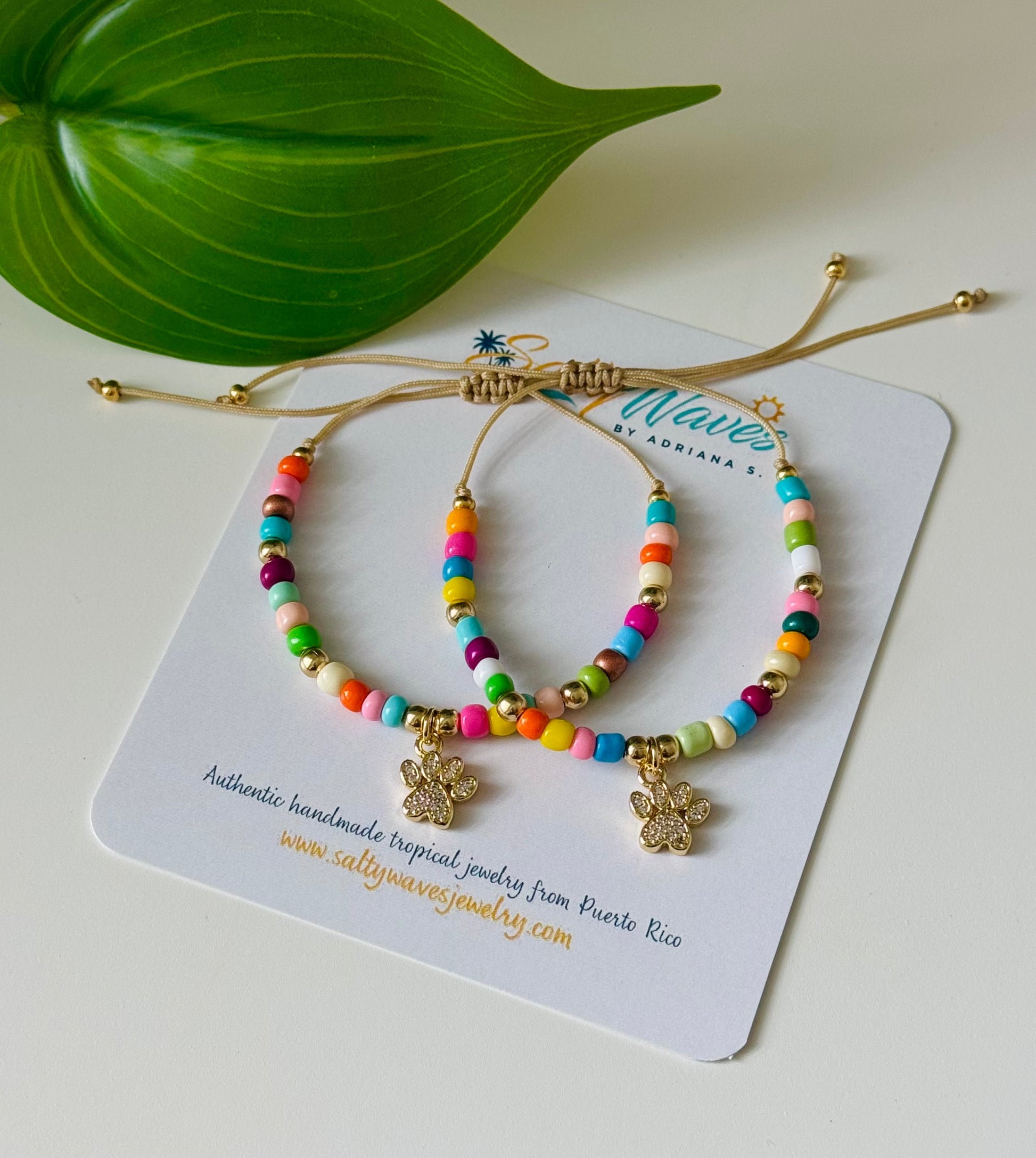 - Pulsera de hilo ajustable hecha con seed beads, huellita en gold plated zirconia y detalles dorados en stainless steel.