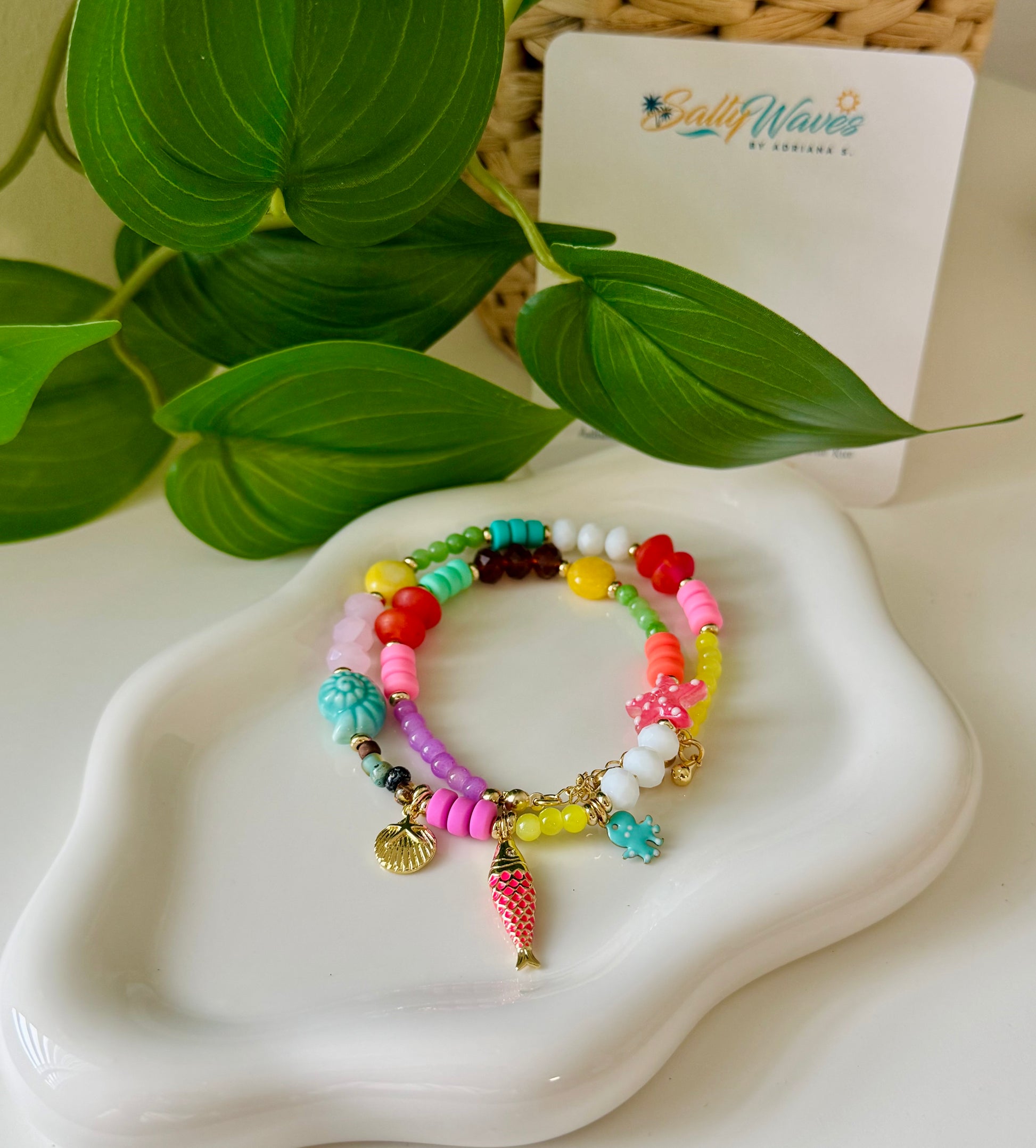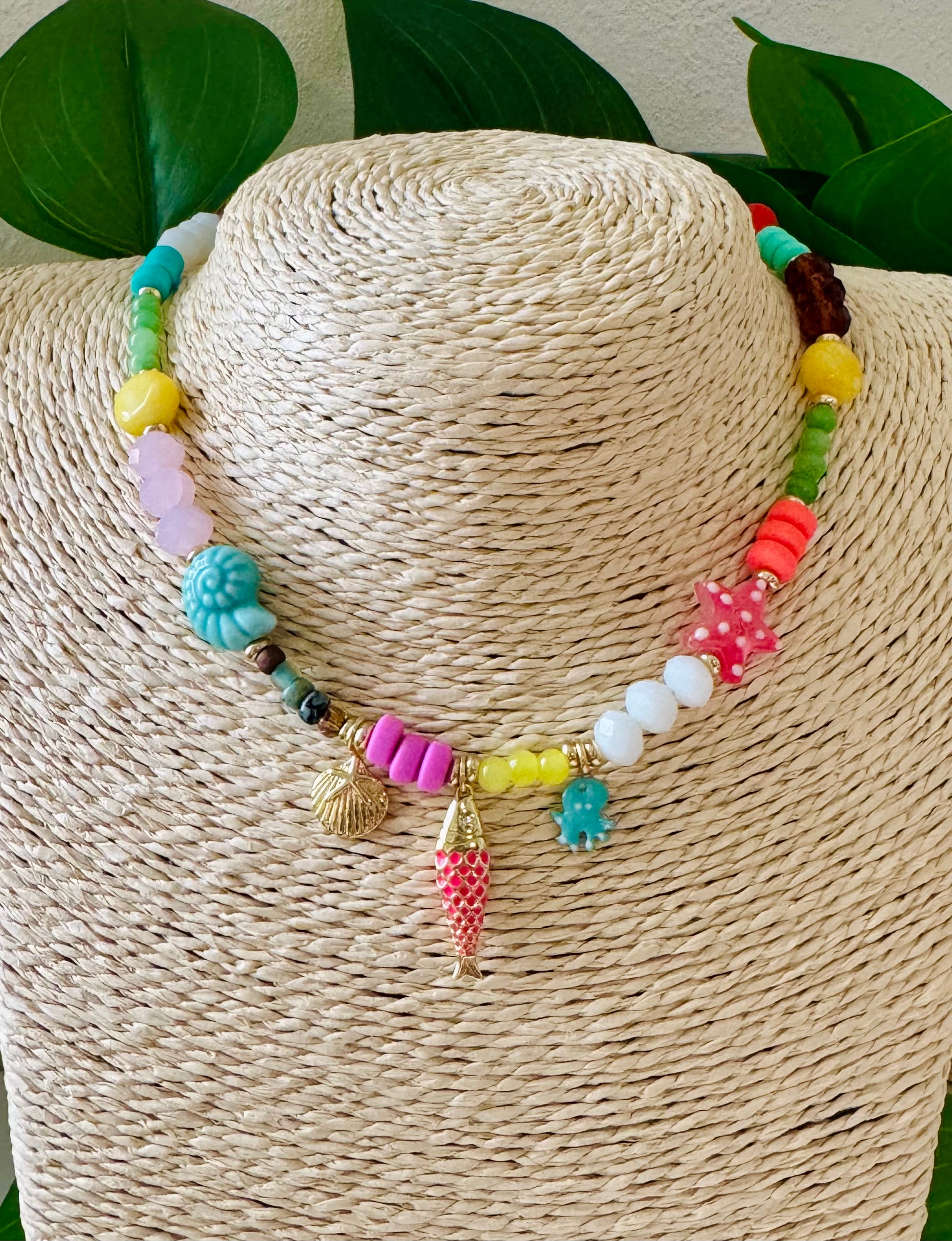 Una explosión de color con esencia caribeña: estrellas de mar, conchas y detalles encantadores que hacen de este collar una joya divertida y única.