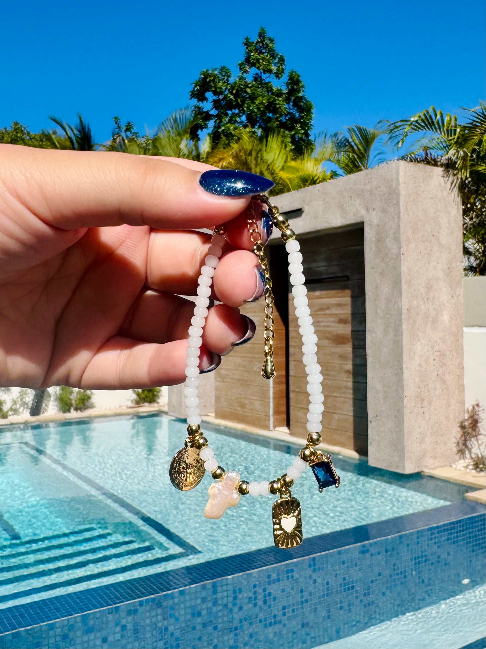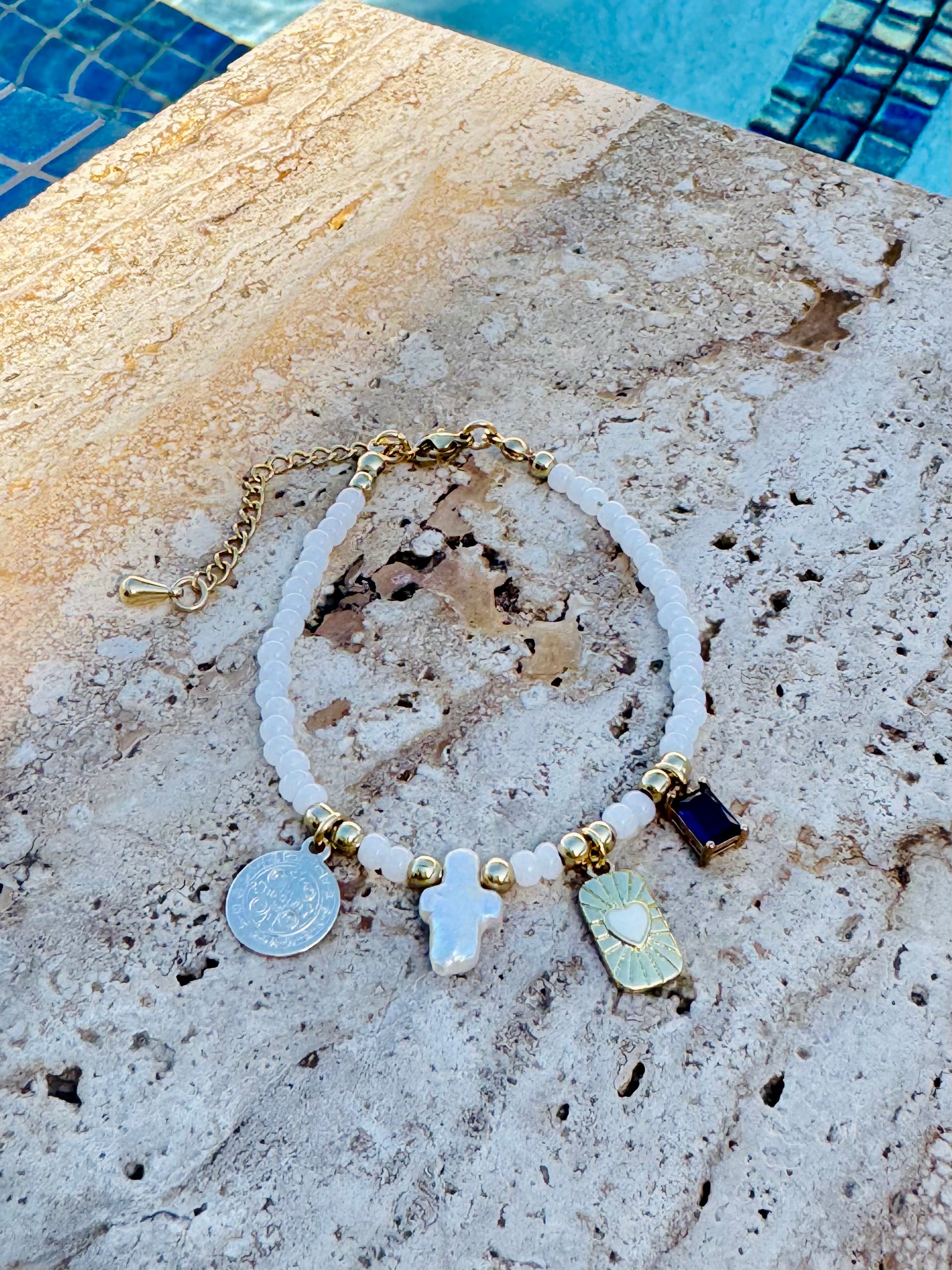 Serenity es una pulsera creada para transmitir calma, equilibrio y luz interior. Sus cuentas en tonos blancos evocan paz y claridad, mientras los charms cuidadosamente seleccionados —cruz, corazón sagrado, medalla y detalle azul profundo— simbolizan fe, protección y serenidad emocional.
