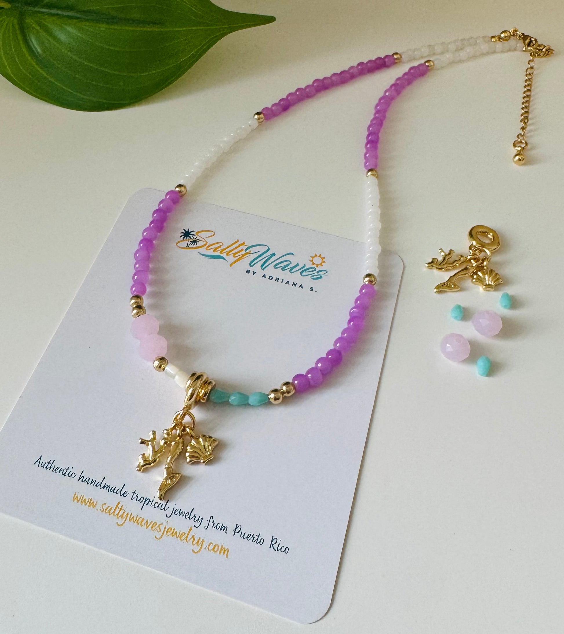 Este collar combina tonos lila, blanco y aqua con detalles dorados que capturan la esencia fresca y femenina del mar. Incluye charm marino en dorado que representan libertad, calma y aventura.