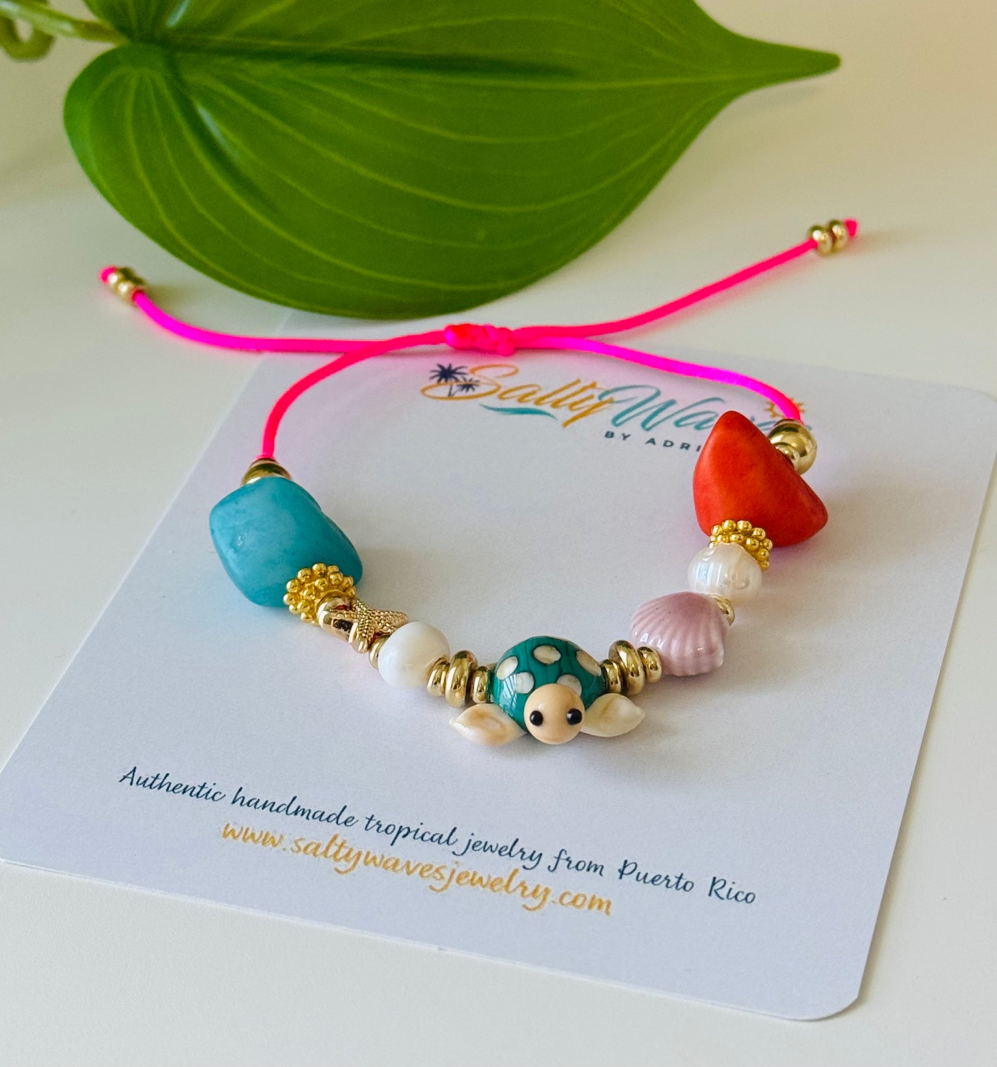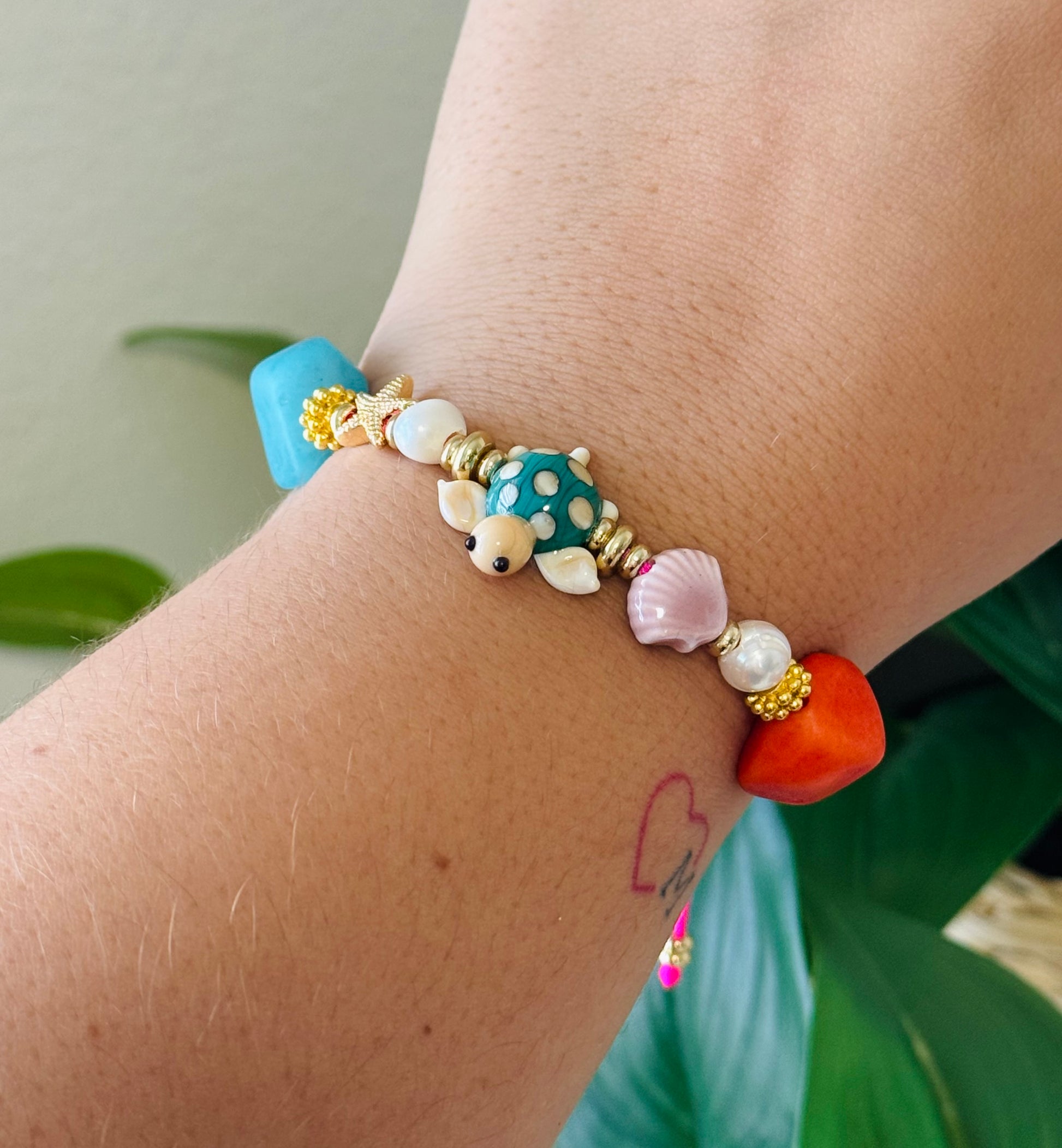 - Pulsera en hilo ajustable con tortuga en lampwork, concha en porcelana, detalles en stainless steel color oro, resina y perlas de agua dulce.